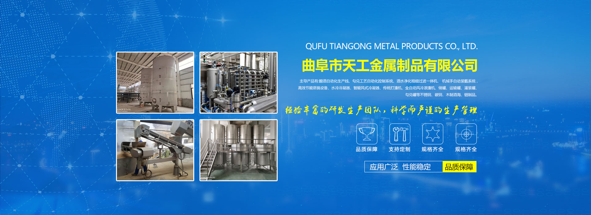 本公司是專業生產不銹鋼酒罐、不銹鋼釀造設備、不銹鋼發酵罐、釀酒、食品、生物、化工、環保設備、制藥設備的廠家。主導產品有:釀酒自動化生產線、勾兌工藝自動化控制系統、酒水凈化粗細過濾一體機、?機械手自動裝甑系統,高效節能蒸鍋設備、水冷冷凝器、智能風式冷凝器、傳統打渣機、全自動風冷涼渣機、儲罐、運輸罐、灌裝罐、勾兌罐等不銹鋼、碳鋼、木制酒海、鋁制品。各種反應釜、發酵罐、提取罐、氣體混合罐、烘干設備等大中型設備安裝,平臺制作、工藝管線制作安裝,容器設備內外防腐保溫。產品規格齊全,質量可靠。